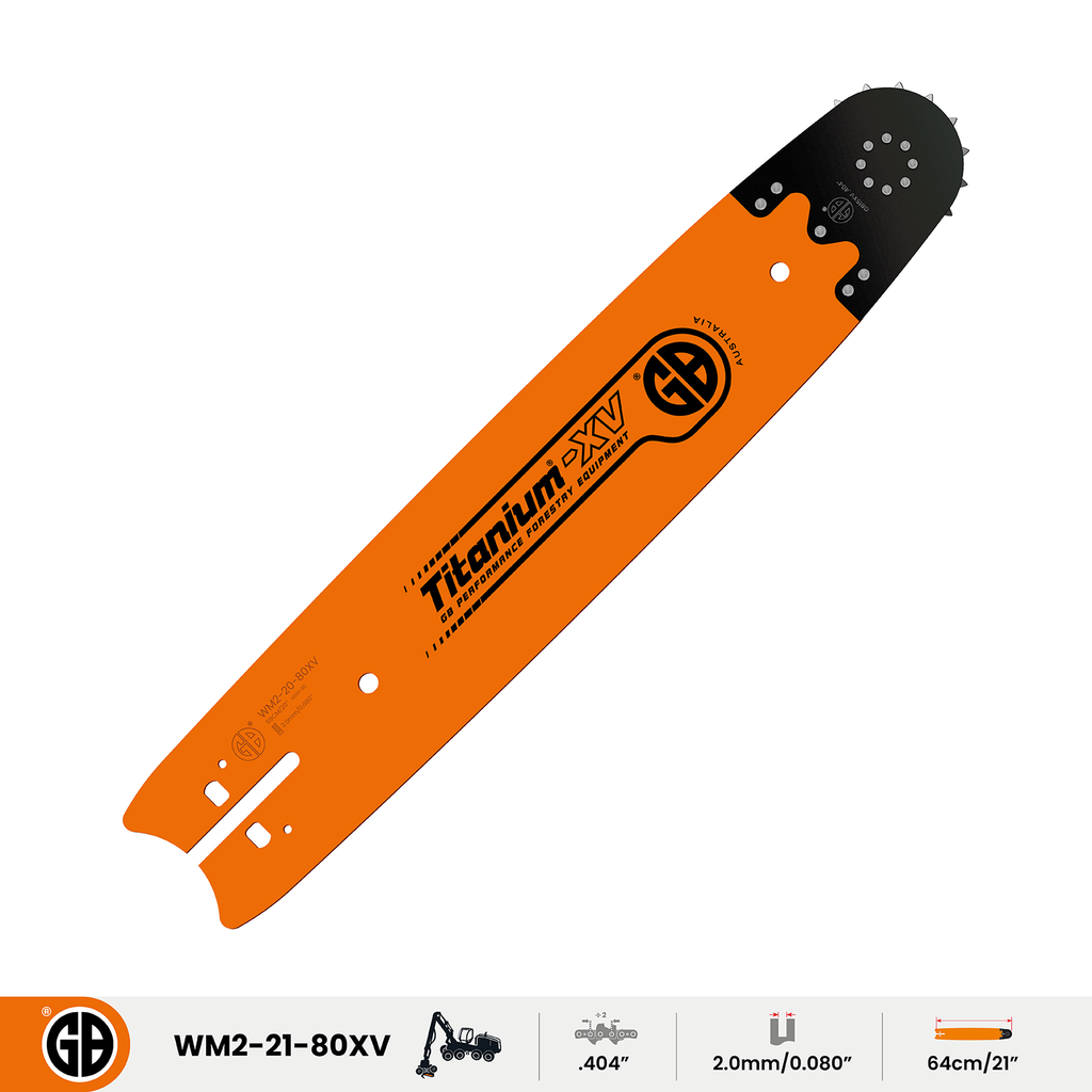 The newly designed GB® Titanium® -XV® professional harvester bar now comes with a 15 tooth nose sprocket, which allows for higher chain tensions that improve efficiency. The patented 15 tooth sprocket and unique oil feeder grooves work together to reduce friction and wear which extends the life of the tip. 2.0mm/0.080"